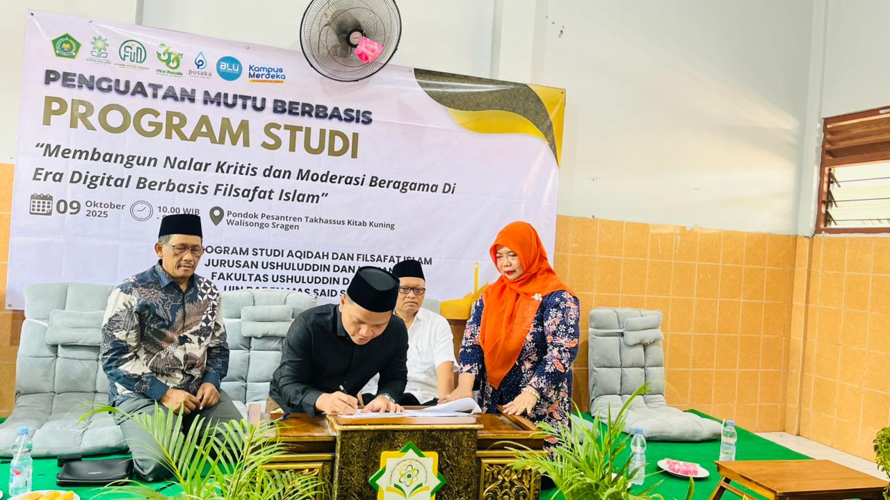 Pada hari kamis, 09 Oktober 2025 Program Studi Aqidah dan Filsafat Islam melaksanakan kegiatan Penguatan Mutu Berbasis Program Studi di Ponpes Takhasus Kitab Kuning Walisongo Sragen. Kegiatan ini bertujuan sebagai sarana komunikasi antara Program Studi Aqidah dan Filsafat Islam dengan stakeholder, alumni, mahasiswa dan calon mahasiswa. Tema kegiatan kali ini Adalah ‘Membangun Nalar Kritis dan Moderasi Beragama di Era Digital Berbasis Filsafat Islam”.